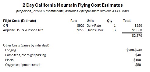 There is a $300 per person deposit to ensure interest. This deposit will be applied towards aircraft and instructor time. All pilots will be paired with an SCFC CFI in an SCFC Aircraft. Deposit is refundable if you withdraw from the trip with less than 4 days notice.